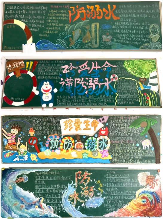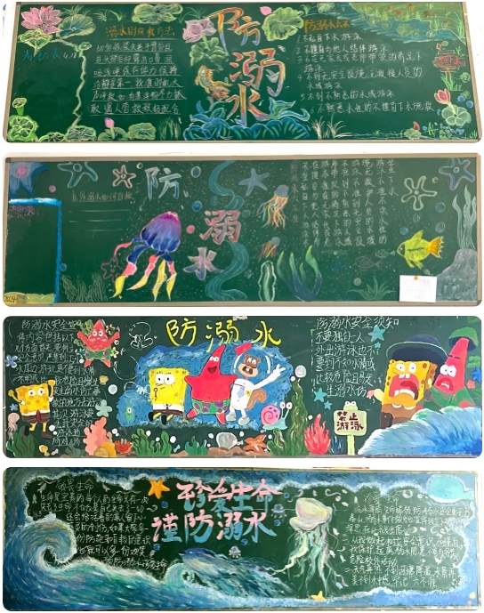 黑板報緊扣活動主題,內(nèi)容豐富,圖文并茂地介紹了溺水事件、溺水中如何自救、如何增強平時的防溺自我保護意識等等,教育意義深遠。