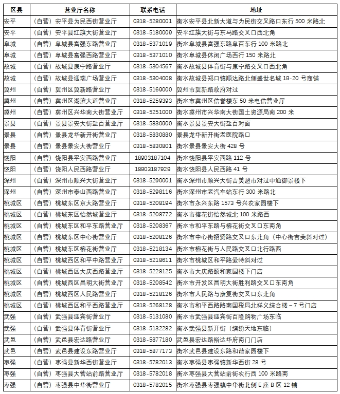 附表:衡水各區(qū)縣電信營(yíng)業(yè)廳地址
